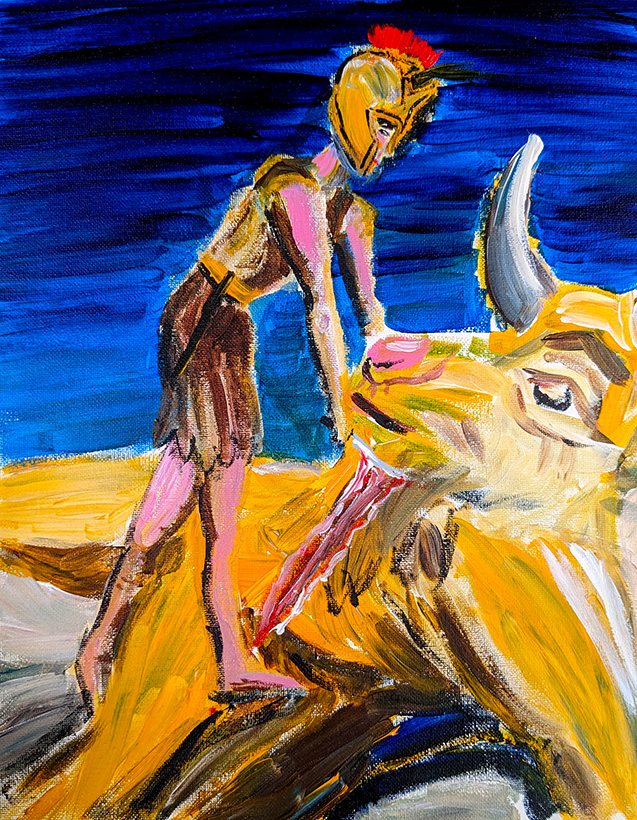 Finally, Graves suggests that the aegis originally described a goat-skin tunic worn by Libyan girls. Death would come to any man who removed the aegis without consent, hence the "Gorgon mask set above it and the serpent concealed in the leather pouch." Inspired by this, and by current events, I painted E Jean Carroll, Medusa, and Trump. I previously blogged about Medusa as well.